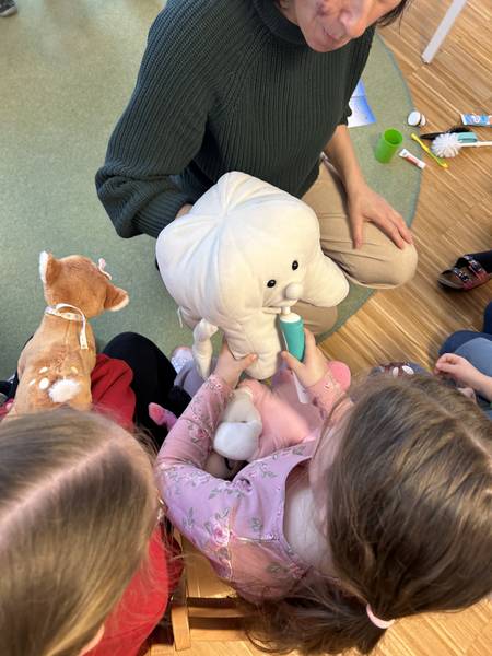 Gemeinsam wurde besprochen, warum Zähne täglich gepflegt werden müssen, welche Lebensmittel gut für die Zähne sind und wie richtiges Zähneputzen funktioniert. Durch anschauliche Materialien, praktische Übungen und viel Raum für Fragen wurden die Kinder aktiv eingebunden und für das Thema begeistert.